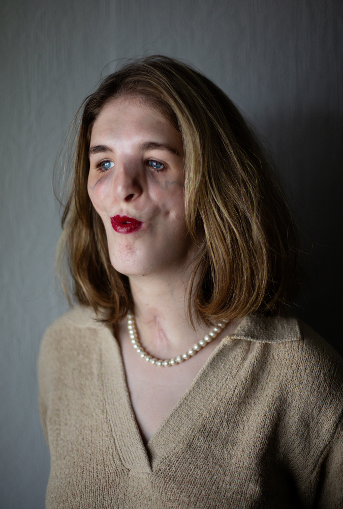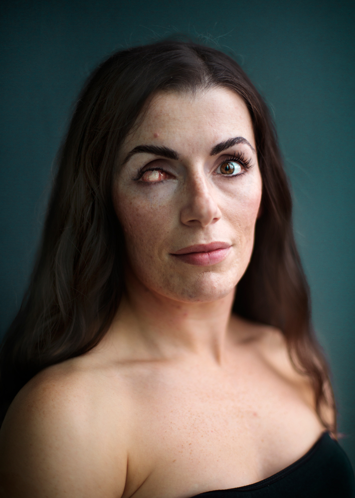 Hattie suffers from severe psoriasis and has, for the past few years, worn an ocular prosthesis in one eye. She runs an Instagram account where she shares her journey and presents herself both with an